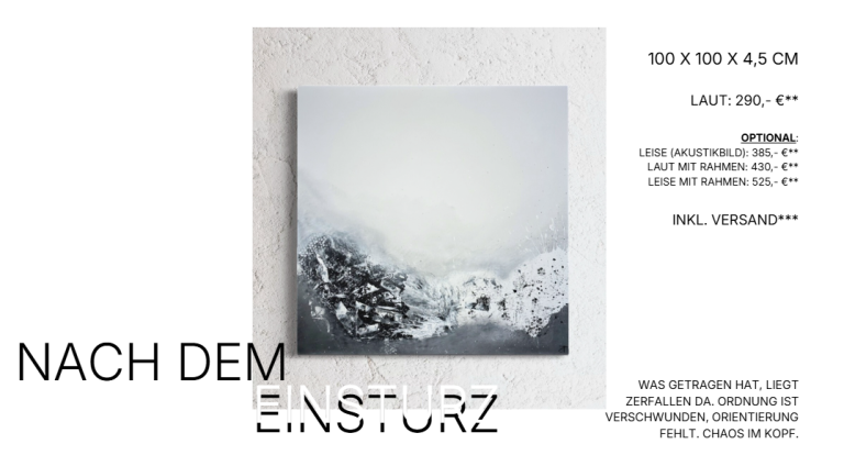 (Fast) jedes meiner Werke entsteht als „laut & leise“-Kunstwerk – das bedeutet: Du kannst es entweder als klassisches Gemälde („laut“) oder als funktionales Akustikbild („leise“) bestellen. Beide Varianten sind handgefertigte Unikate.