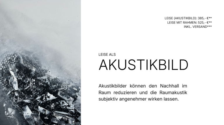 leise: In der Akustikvariante wird das Bild auf der Rückseite mit einem schallabsorbierenden, offenzelligen Schaumstoff ausgestattet. Dieser kann Schallenergie im Mittel- und Hochtonbereich aufnehmen und so den Nachhall im Raum reduzieren. Dadurch kann der Raum subjektiv angenehmer und weniger hallig wirken. Die tatsächliche Wirkung hängt von verschiedenen Faktoren ab – unter anderem von Raumgröße, Bildgröße, Wandflächen, Mobiliar und der Anzahl eingesetzter Akustikbilder. So verbindet sich Design mit Funktion – für eine angenehmere Raumakustik, besonders in offenen Wohnbereichen, Büros oder Praxisräumen.
