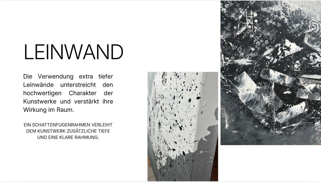 Auf Wunsch erhält dein Kunstwerk einen eleganten Schattenfugenrahmen in Naturholz. Dieser rahmt das Bild dezent, ohne es zu erdrücken. Zwischen Leinwand und Rahmen entsteht eine feine Fuge, die dem Werk Tiefe und eine besonders hochwertige Wirkung verleiht.