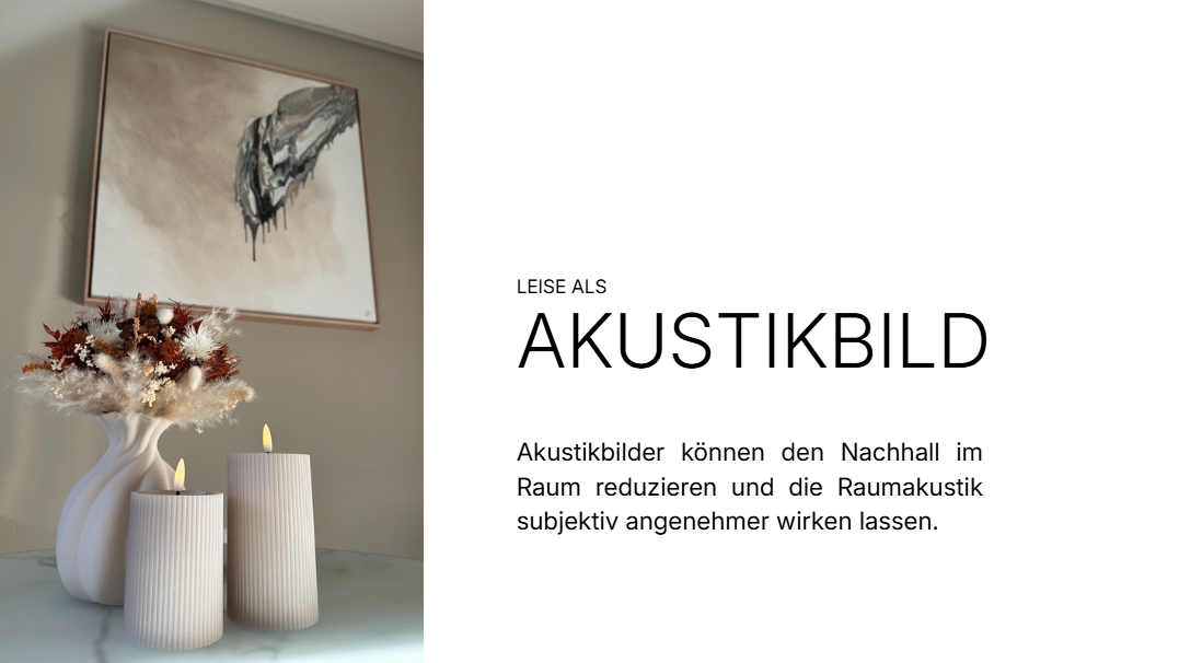 leise: In der Akustikvariante wird das Bild auf der Rückseite mit einem schallabsorbierenden, offenzelligen Schaumstoff ausgestattet. Dieser kann Schallenergie im Mittel- und Hochtonbereich aufnehmen und so den Nachhall im Raum reduzieren. Dadurch kann der Raum subjektiv angenehmer und weniger hallig wirken. Die tatsächliche Wirkung hängt von verschiedenen Faktoren ab – unter anderem von Raumgröße, Bildgröße, Wandflächen, Mobiliar und der Anzahl eingesetzter Akustikbilder. So verbindet sich Design mit Funktion – für eine angenehmere Raumakustik, besonders in offenen Wohnbereichen, Büros oder Praxisräumen.
